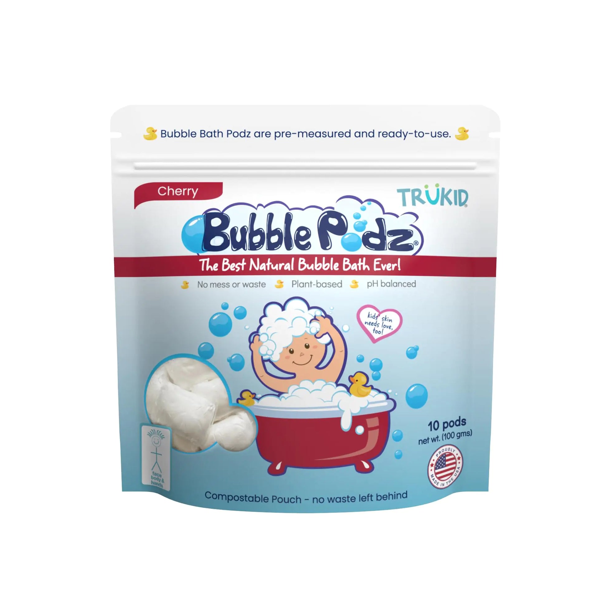 [Bubble Podz – Bubble Bath - Let your children splish and splash in a foamy natural bubble bath from TruKid! This gentle bath formula comes in an efficient pod form and is parent-designed for sensitive skin. No-Mess single use pod makes bubble baths so easy. Simple Suds – Hold a pod under warm running water until dissolved and agitate bubbles until bubbly—it’s that simple! Enjoy baby bath fun in your choice of 8 scents with family-friendly size package options. Bubble Podz are a better cost value than liquid bubble baths we are committed to helping reduce plastic waste. Better for the environment and for your family. Please reseal the bag or pouch after each use. This will ensure that pods stay fresh. Cherry Scent – Just like Cherry soda or fresh Cherry Pie. Smells so good. A light smell that parents like too. For sensitive skin and formulated by a parent but made for kids so they can take a long lasting great smelling bubble bath. Made in the USA Naturally – Choose Bubble Podz full of pure bubbly goodness. Feel good about the simple formula that features 5 plant-based non toxic carefully tested and sustainably sourced ingredients. Stay Tru – Trusted by families since 2008 to deliver a full range of gentle baby bath essentials and kids’ skin care products. We’re committed to bringing you and your child a fun and gentle bath-time experience.]