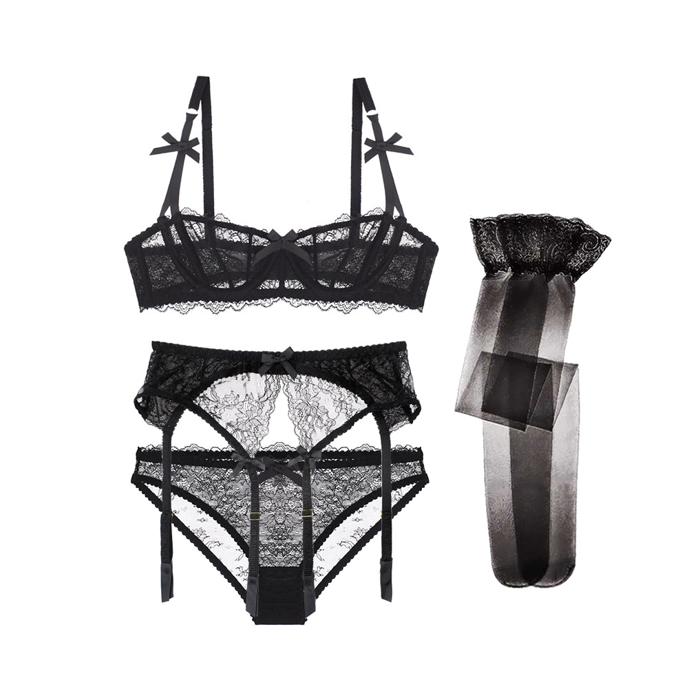 Discover the allure of the Varsbaby Half Cup Sexy Lace 4-Piece Set, designed for the modern woman who desires both elegance and comfort. This stunning lingerie set includes a beautifully crafted bra, matching panties, a seductive garter belt, and sheer stockings, all designed to enhance your natural curves and boost your confidence.