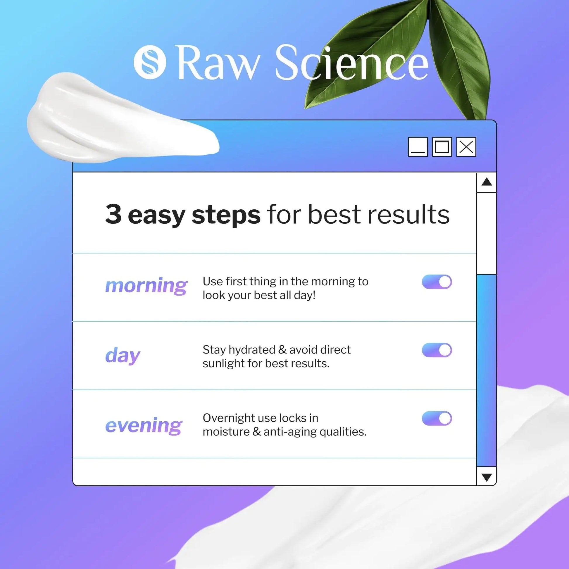 SKIN FIRMING FACE CREAM: At Raw Science, we believe in the power of our face cream anti aging formula. Thats why our firming moisturizer face cream delivers on the promises we make. Say goodbye to dull, wrinkled skin and hello to your youth.